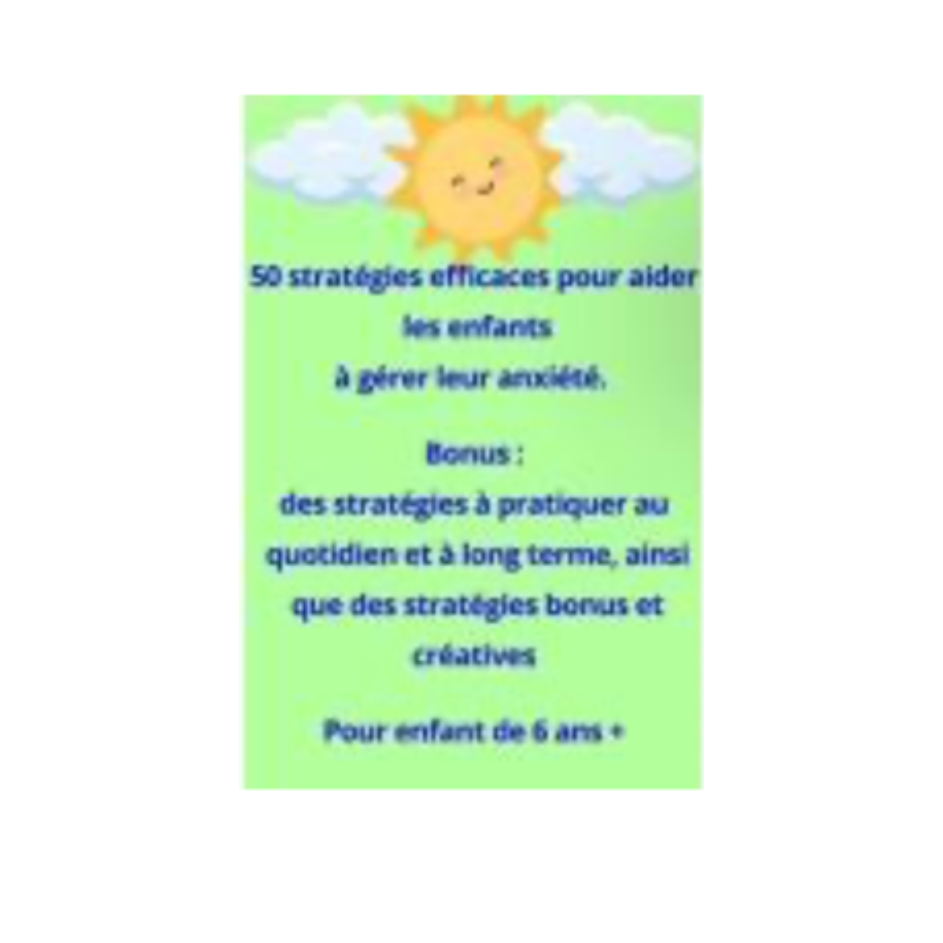 L’anxiété est une émotion naturelle que tous les gens peuvent ressentir à un moment ou un autre. Toutefois, lorsqu’elle devient trop présente ou difficile à gérer, elle peut affecter le bien-être, la concentration, les relations ou la confiance aux autres. Ce guide a été conçu spécialement pour les enfants de 8 ans et plus, ainsi que pour les adultes qui les accompagnent – parents, enseignants, éducateurs ou intervenants. Il contient 50 stratégies simples, efficaces et ludiques pour aider les gens à mieux comprendre, exprimer et gérer leur anxiété au quotidien. Chaque technique est présentée avec un objectif clair et une explication concrète pour faciliter sa mise en pratique. Le but n’est pas de faire disparaître complètement l’anxiété, mais de vous donner des outils pour l’apprivoiser, la comprendre et retrouver un sentiment de calme et de sécurité intérieure. Vous pouvez utiliser ce guide de manière libre : en lisant une stratégie par jour, en choisissant celles qui vous conviennent ou en les adaptant selon vos besoins. Parce que chaque personne est unique, vous trouverez vos propres façons de vous sentir mieux. Ce livre est une boîte à outils bienveillante, pour vous aider à grandir avec plus de sérénité, de confiance et de paix intérieure